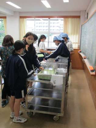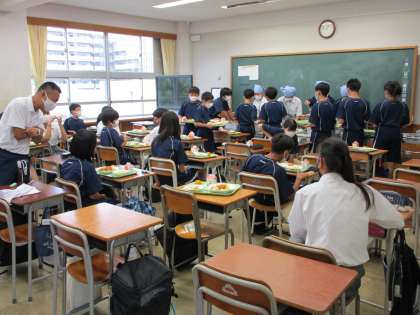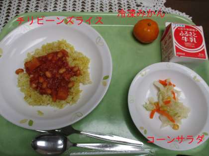 2学期最初の給食は、チリビーンズライスにコーンサラダ、デザートに冷たくておいしい冷凍みかんがつきます。