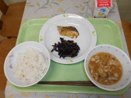 麦ごはん 牛乳 魚の照り焼き ひじきの煮つけ 豚汁
