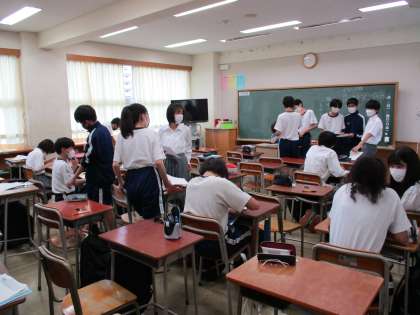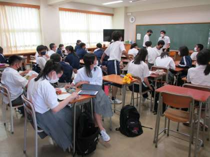 2年生は、職場体験学習に向けて受け入れ先に持っていく自己紹介カードの記入を行っていました。