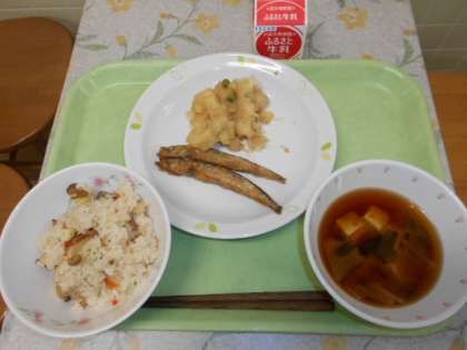 秋の香りごはん 牛乳 ししゃものからあげ じゃがいもの甘辛煮