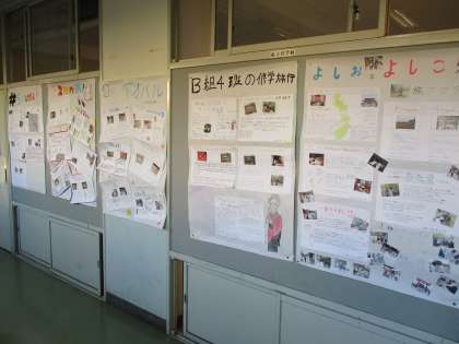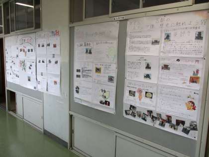 3年生の廊下には事後学習の班新聞が貼ってあります。