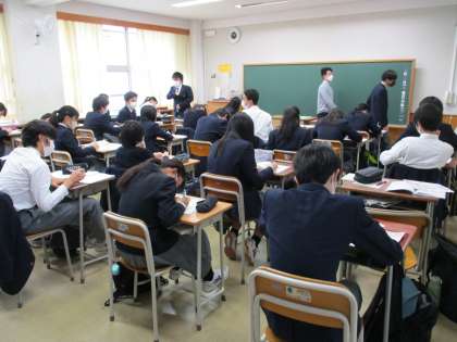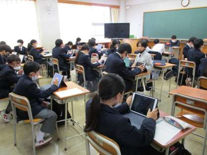 1年生は、タブレットを片手に校外学習の下調べを、3年生は面接練習に備え、設問に対する答えを記入していました。