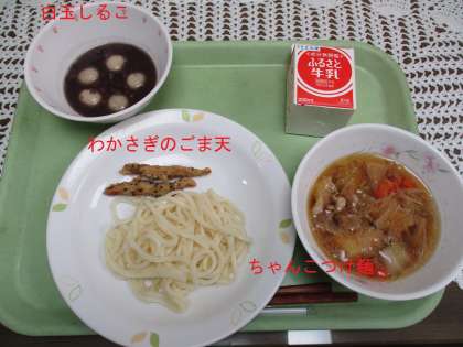 3学期給食初日は、ちゃんこつけ麺、わかさぎのごま天、そして鏡開き献立白玉しるこです
