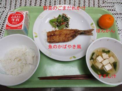 麦ごはんに魚のかばやき風、野菜のごまだれかけにすまし汁です。それにくだもの(ぽんかん)がつきます。