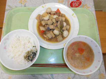 麦ごはん ふりかけ 牛乳 鶏肉と里芋のうま煮