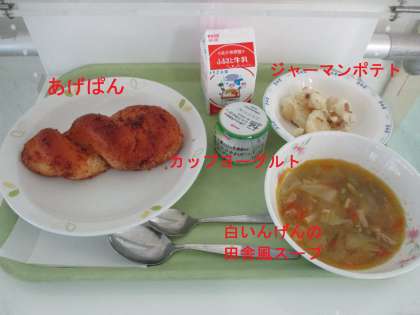 きょうは、全校からリクエストのあった あげぱんです。白いんげんの田舎風スープとジャーマンポテト、カップヨーグルトが付きます。