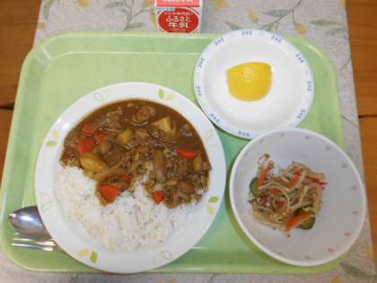 チキンカレーライス 牛乳 こんにゃくサラダ くだもの
