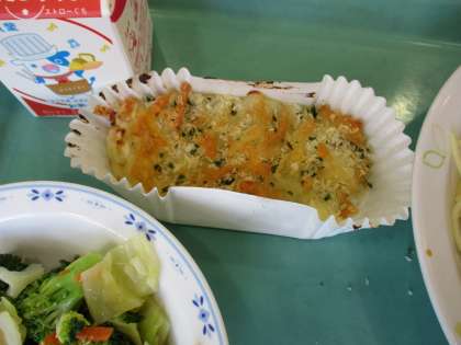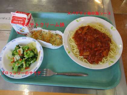 きょうの献立のポテトクリーム焼きは3Dのリクエストです。スパゲティ地中海ソースにブロッコリーのサラダです。
