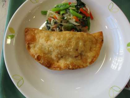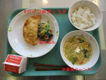 麦ごはん、ジャンボ餃子、塩ナムルに中華コーンスープです。ジャンボ餃子は、1学年、2学年などたくさんのリクエストがありました。