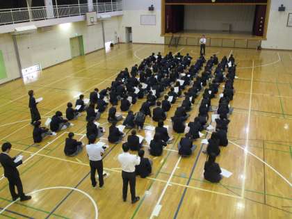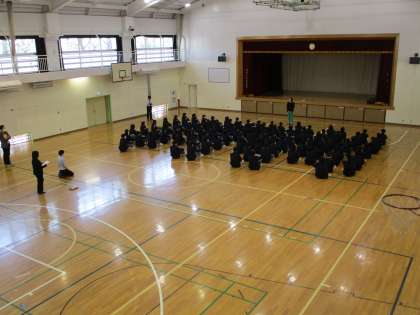 2年生と1年生は土曜日、3年生は今日体育館で行いました。各先生方の話や並び方などをやっていました。