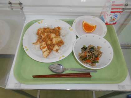 麻婆豆腐丼 牛乳 ナムル くだもの
