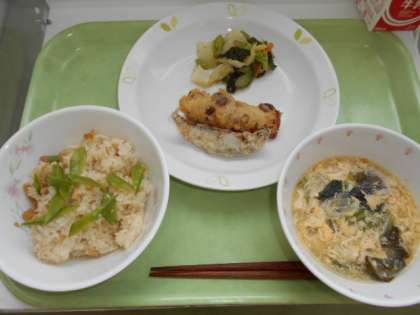 たけのこごはん 牛乳 ししゃものからあげ ちくわのえび粉あげ