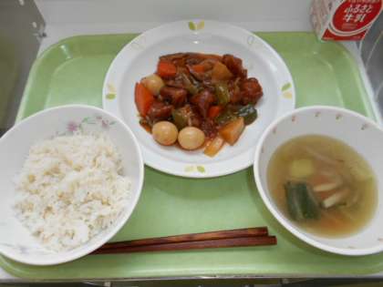 麦ごはん 牛乳 酢豚 きのこと青菜のスープ