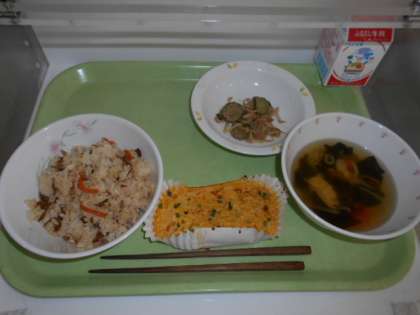 豚肉とごぼうのごはん 牛乳 卵焼き ごま酢かけ