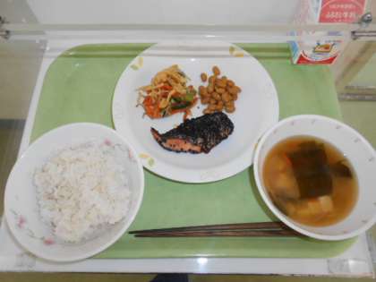 麦ごはん 牛乳 鮭の南部焼き カリカリ油揚げと野菜のひたし