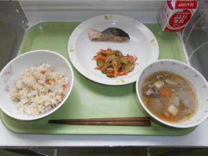 豆ごはん 牛乳 魚の照り焼き かみかみサラダ