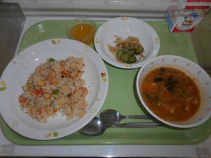 えびチャーハン 牛乳 麻婆汁 きゅうりともやしの中華味