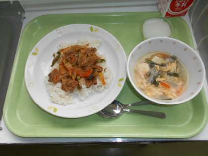 夏野菜の豚キムチ丼 牛乳 ザーサイスープ