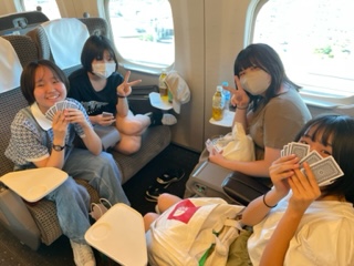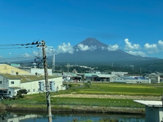 新幹線の車窓から富士山がバッチリ見えました。車内では楽しそうに話すグループやリラックスしているグループと様々です。