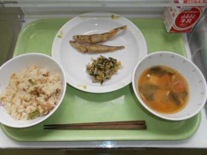 しめじごはん 牛乳 ししゃものからあげ 野菜の磯辺あえ