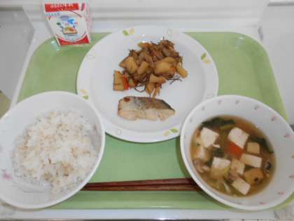 麦ごはん 牛乳 魚の西京焼き きざみこんぶの五目煮