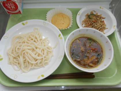 つけ麺風カレーうどん 牛乳 野菜のごまあえ