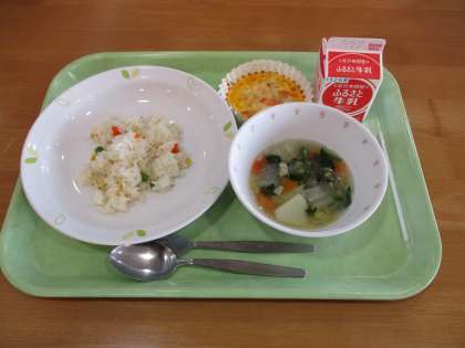 三色ピラフ 牛乳 キッシュ レンズ豆と野菜のスープ