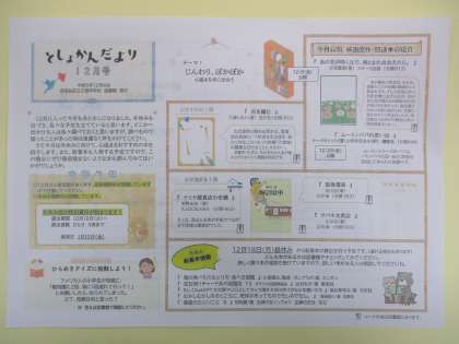 図書館だよりより 公開日 2023/12/04 更新日 2023/12/04 学校日記 12月のテーマは“じんわり、ぽかぽか”〜心温まる本に出会〜。寒い季節に本を読み心から温まるのはいかかでしょう。 いいね(0)