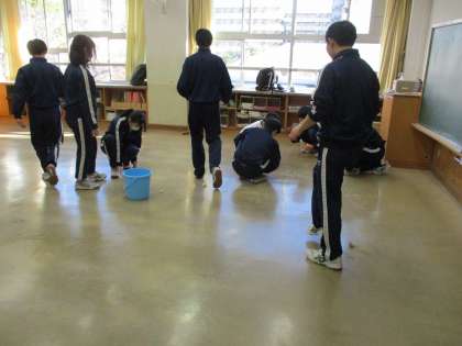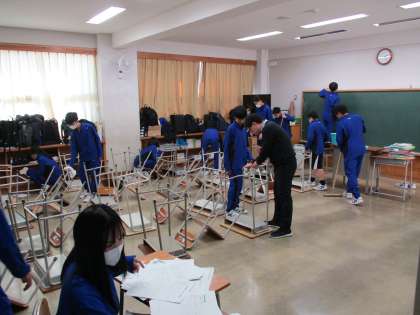 教室の机椅子を廊下に出し、床や壁をきれいにしていきます。