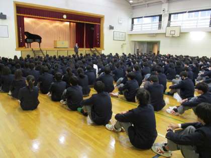 3学期が始まりました。校長先生の話に続いて校歌斉唱。表彰、3学期の生活について話がありました。