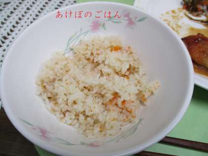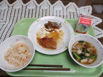 3学期最初のメニューは“あけぼのごはん”に鶏肉の照り焼きソース、紅白なます、吉野汁です。