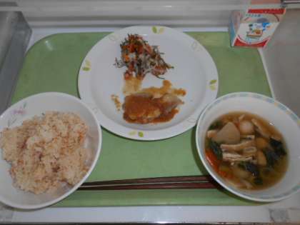 あけぼのごはん 牛乳 鶏肉の照り焼きソース 紅白なます
