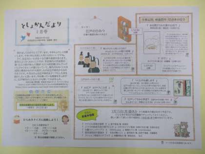 としょかんだよりより 公開日 2024/01/11 更新日 2024/01/11 学校日記 1月号のテーマは“江戸のひみつ”です。江戸時代から伝わる正月行事や風習も多く、調べてみてはどうでしょう。 いいね(0)
