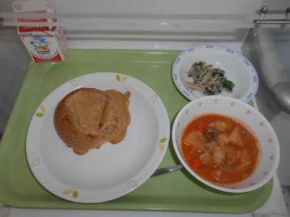 セサミビスキュイパン 牛乳 ボルシチ こまつなサラダ