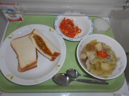 ドライカレーサンド 牛乳 ポトフ にんじんサラダ