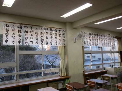 教室の窓側に書き初めが展示してあります。例年作品展でも展示しています。