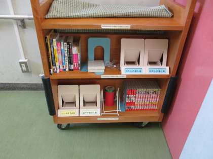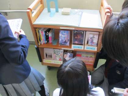 昼休みにワゴンに乗せて貸し出しをします。対応は図書委員です。