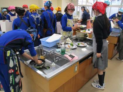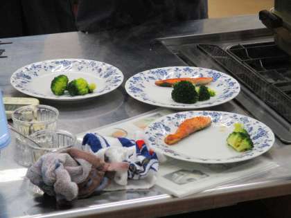 今回の献立は、魚(鮭)のムニエルと蒸し野菜です。手際よく進められていました。。