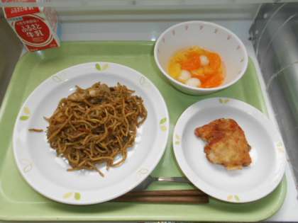 ソース焼きそば 牛乳 鶏肉のからあげ 白玉入りフルーツポンチ