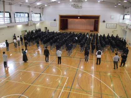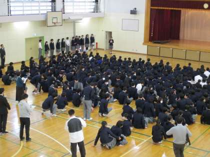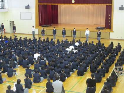 今回が今年度最後の朝会です。生徒会本部役員からの報告と各専門委員長からの報告がありました。