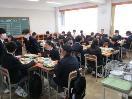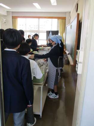 中学校での初めての給食です。当番もエプロンに三角巾になっています。