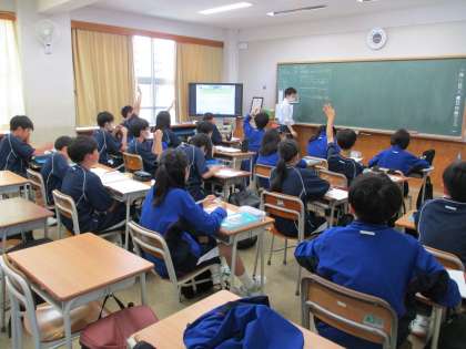 2年生の理科の授業では、顕微鏡の使い方を学習していました。校庭からは体育の大縄の元気な声が聞こえてきます。数学の授業は少人数で実施です。