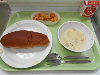 黒砂糖パン 牛乳 ポテトグラタン キャベツのクリームスープ