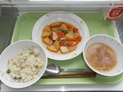 青菜とじゃこのごはん 牛乳 新じゃがのそぼろ煮 沢煮椀