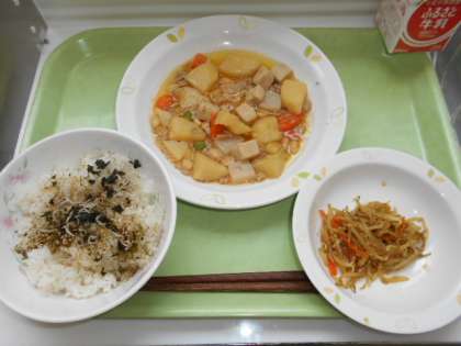 麦ごはん 牛乳 ふりかけ ジャガイモのそぼろ煮