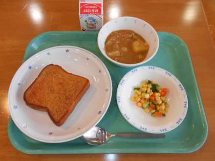 きな粉豆乳トースト 牛乳 ポークシチュー トロピカルサラダ