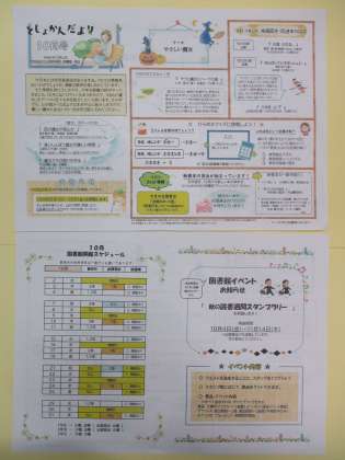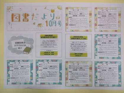 今月のテーマはハロウィンにちなんで「やさしい魔女」です。魔女をテーマにした本の紹介です。委員会便りで図書委員会おすすめ本が紹介されています。お昼の放送でも紹介しています。