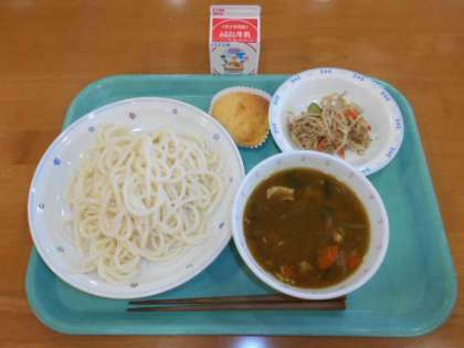 つけ麺風カレーうどん 牛乳 野菜のごまあえ パインケーキ