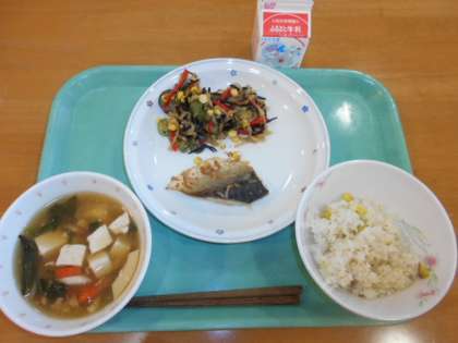 さつまいもごはん 牛乳 さばの七味焼き 大根とひじきのサラダ