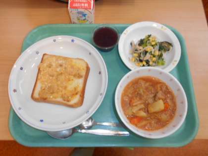 ツナトースト 牛乳 ボルシチ こまつなサラダ